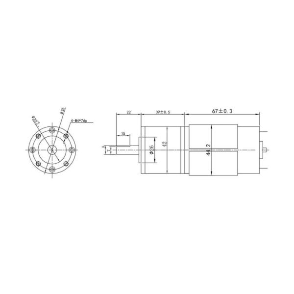 Gearbox dimension: 42mm*39mm L; DC motor Length: 67mm